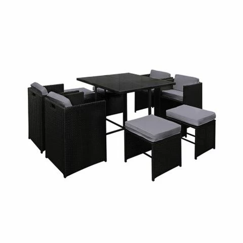 9 Piece Wicker Outdoor Dining Set Black & Grey, Made from powder coated steel frame and UV resistant PE wicker, the dining set is made for durability.