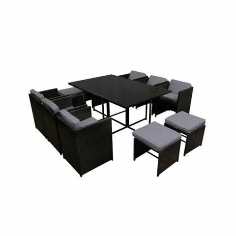 11 Piece PE Wicker Outdoor Dining Set Black, Made of power coated steel frame and UV resistant PE wicker the outdoor dining set is made for durability.