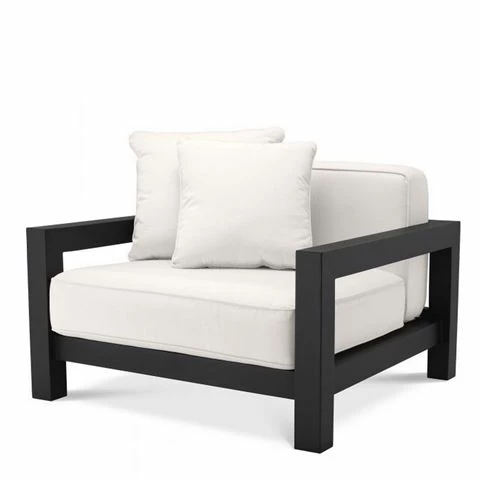This luxurious sofa is expertly crafted from durable aluminium and provided with a black powdercoated finish. Its seat and back cushions are upholstered in Sunbrella canvas.