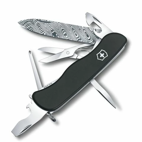 The Outrider Damast Swiss Army Knife contains ten of the most popular tools in the Swiss Army Knife range – including blade, can opener, reamer, wire stripper, keyring and more. The large blade is also made from precious damascus (translates to “damast” in German) steel, which is a type of steel that was used in ancient Indian and Middle Eastern swordmaking.